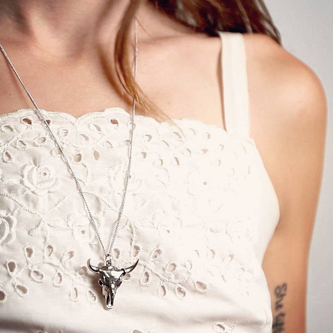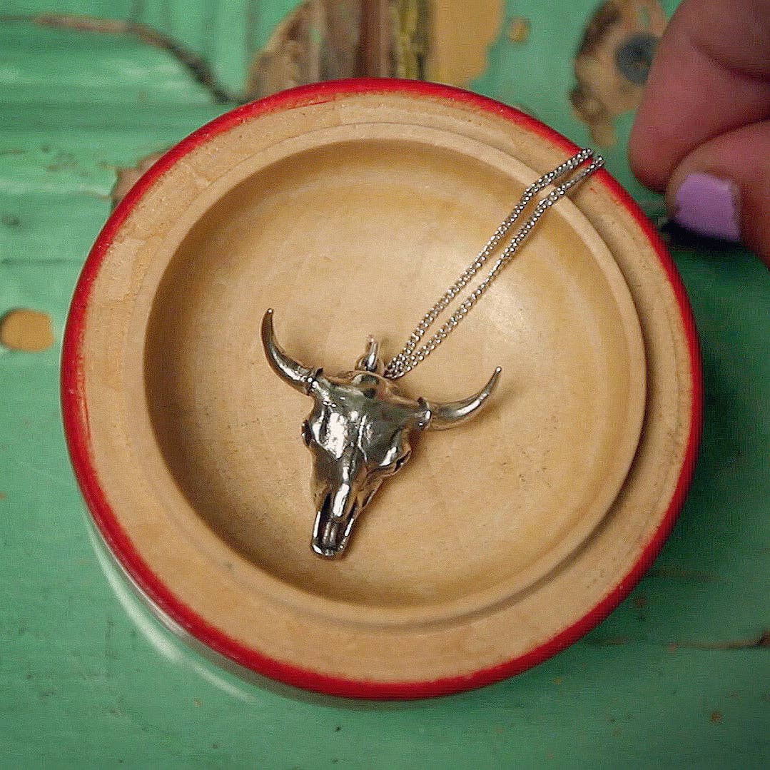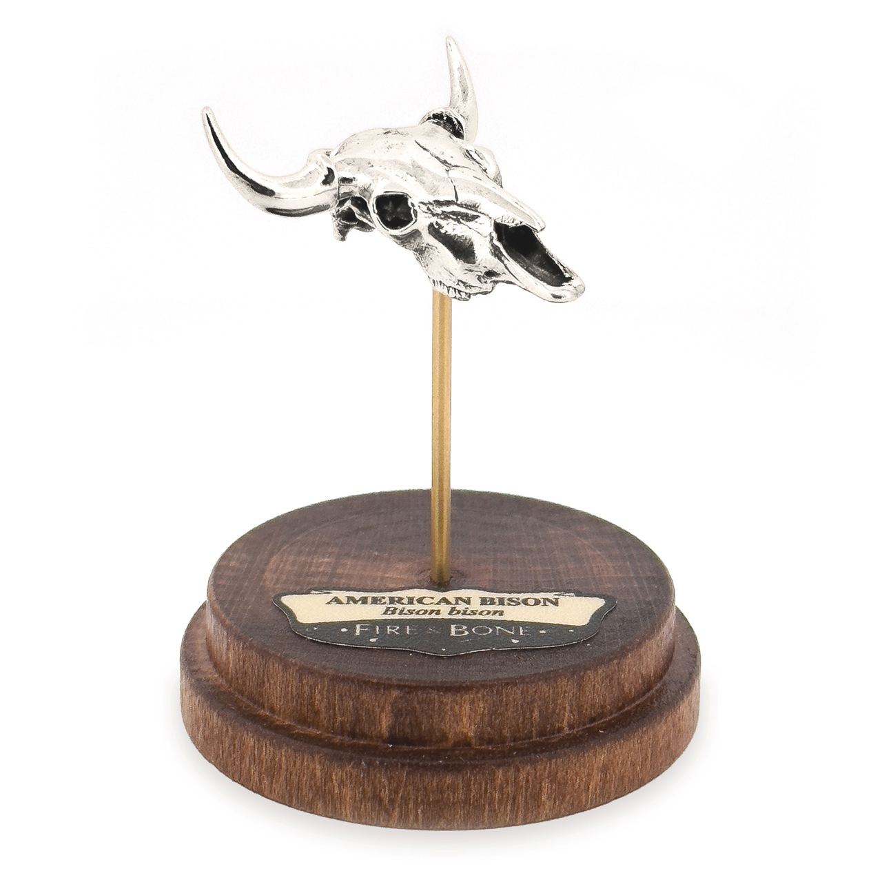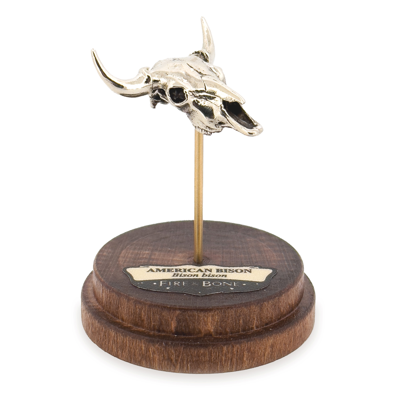 American Bison Skull Pendant Bison bison - American Bison typically live in river valleys, and on prairies and plains. Hunted nearly to extinction, this species is now out of the danger zone, with about 30,000 now considered truly wild. Includes matching 24 inch chain. Wooden display base optional. Skull Dimensions: 31mm x 28mm x 16mm