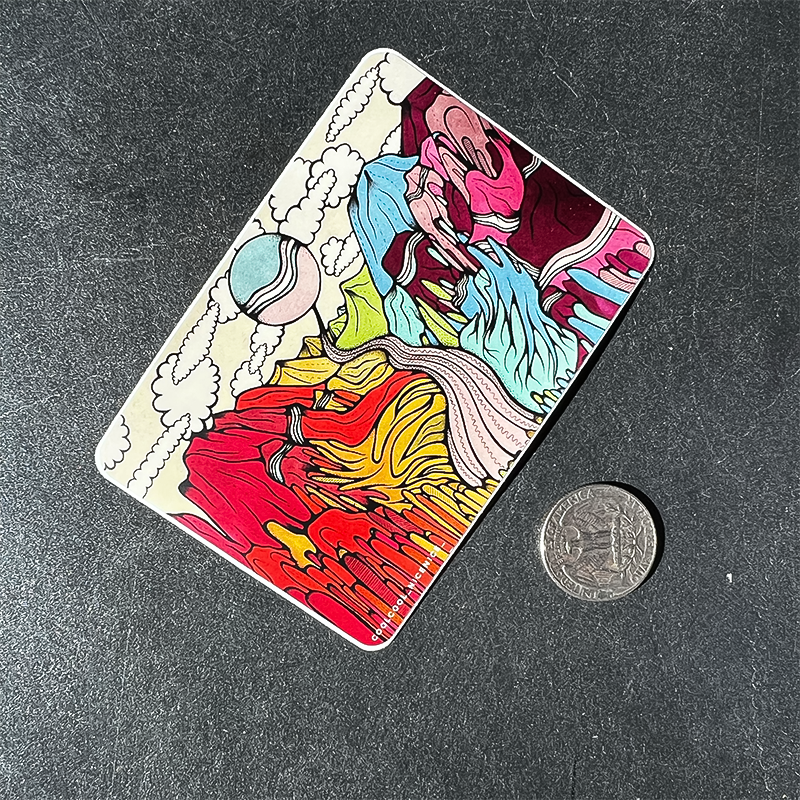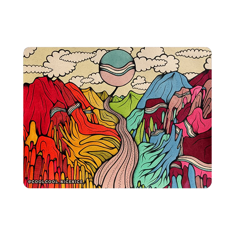The Cool Cool Nice Nice Rainbow Landscape Sticker is a vibrant 3 x 4" piece of wearable art that brings a burst of color to any surface. This durable sticker showcases an original pen and ink illustration depicting a fantastical, psychedelic landscape. The design features a mesmerizing array of rainbow-hued mountains and valleys, each with its own intricate patterns and textures. A winding path leads through the center, guiding the eye through the colorful terrain. Fluffy clouds float above in a pale sky, adding a dreamy quality to the scene. Perfect for personalizing laptops, water bottles, or notebooks.