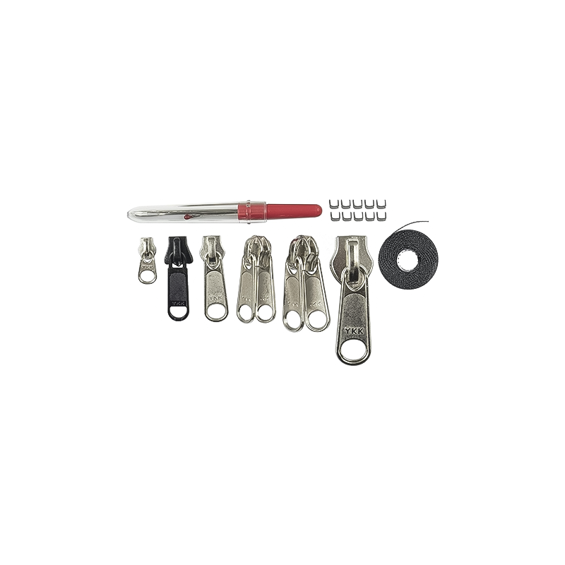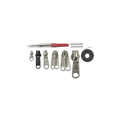 This kit is compatible with the most common zipper sizes, making it a versatile tool for fixing zippers on clothing, backpacks, jackets, and other outdoor gear. It includes an assortment of zipper sliders, a sewing kit with two large needles and black thread, and 10 top stops for added durability. The included repair guide provides step-by-step instructions to ensure a successful repair every time.