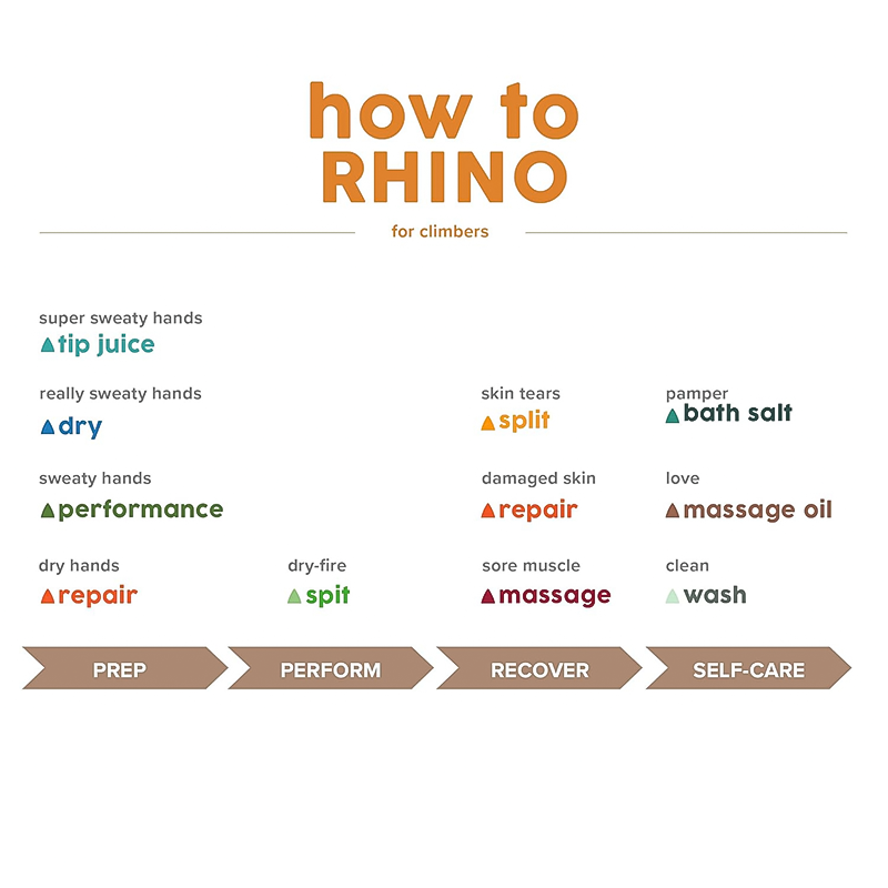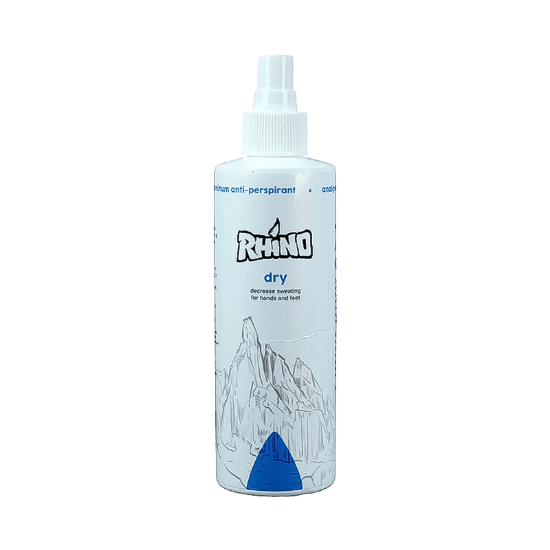 Rhino Dry Spray is the next step up from Rhino Performance, for climbers who suffer from overly-sweaty hands and fingertips. It’s a drying spray that you simply spray on and leave for 8 hours as it applies and activates. Dry Spray is an excellent product and a lifesaver for many climbers, but should be used with caution when applying for the first time!