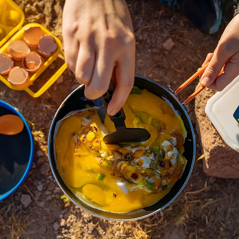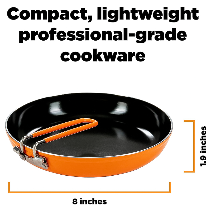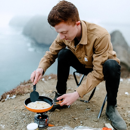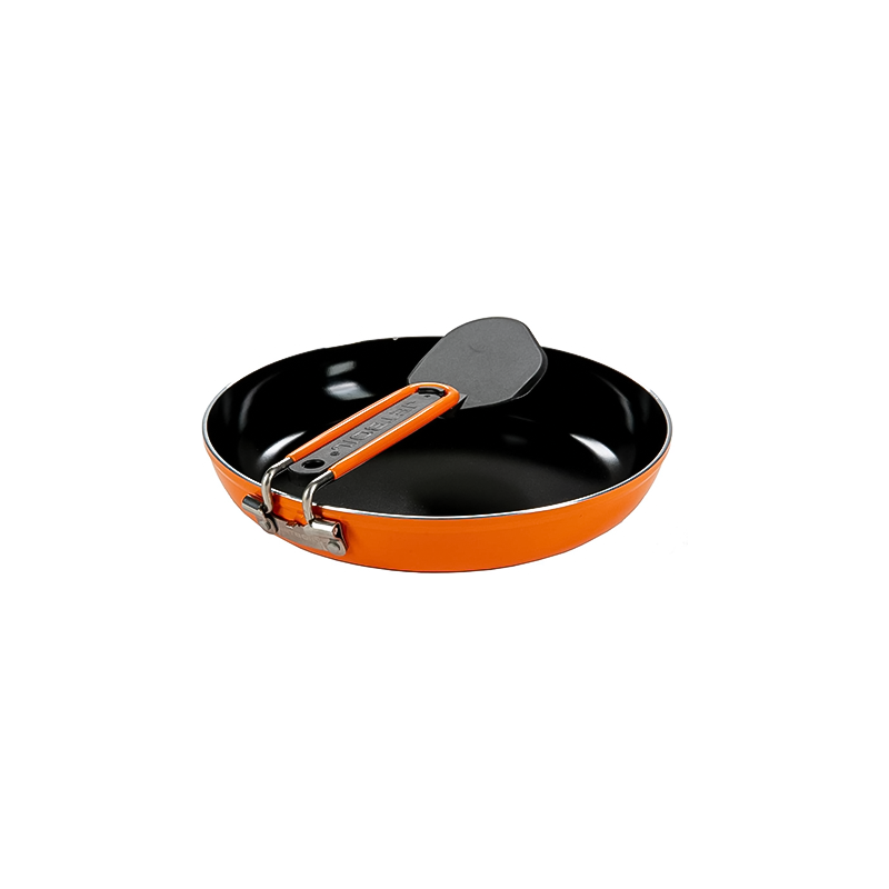 Jetboil's newly redesigned Summit Skillet is an awesome addition to your backpacking kit. It's weighs just 10.6oz and is 8.5in in diameter with a collapsible handle and built-in spatula. Not to mention the skillet has an eco-friendly, pfoa-free, non-stick ceramic coating that is scratch resistant and cleans with just a wipe of a rag. You'll be psyched when you're on dish duty. The varied aluminum wall thickness is designed to distribute heat evenly so you can create a decadent home-cooked meal at the top of the sierras!